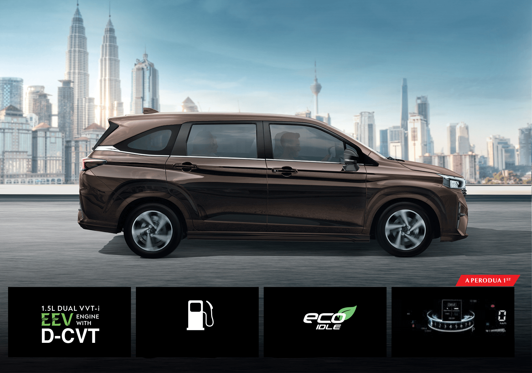 7 tempat duduk, luas dan selesa. Ruang kaki yang lebih panjang.